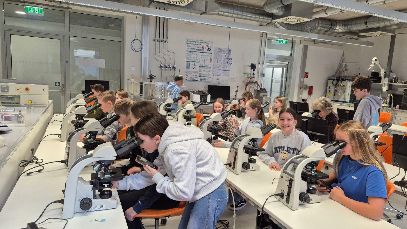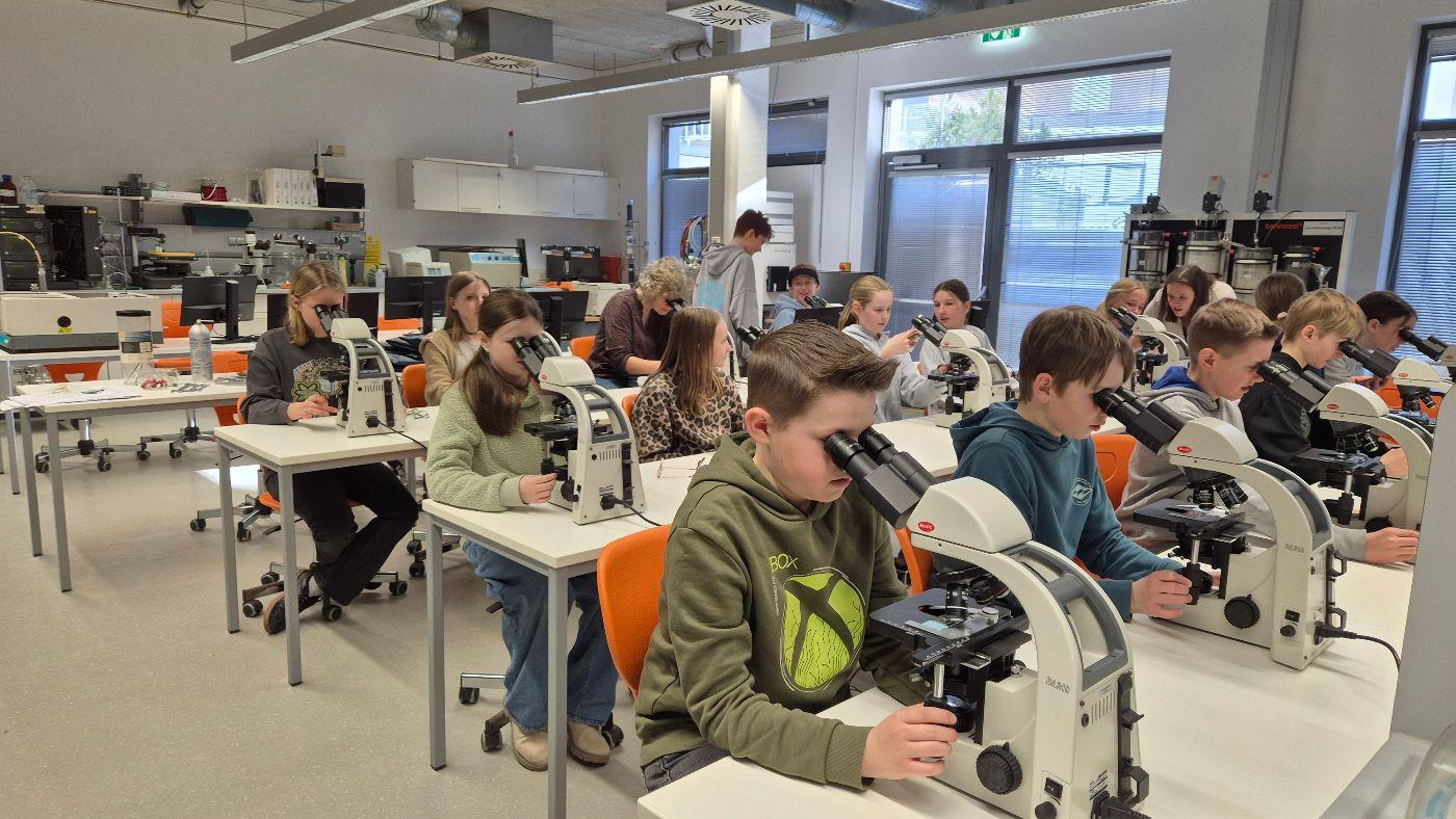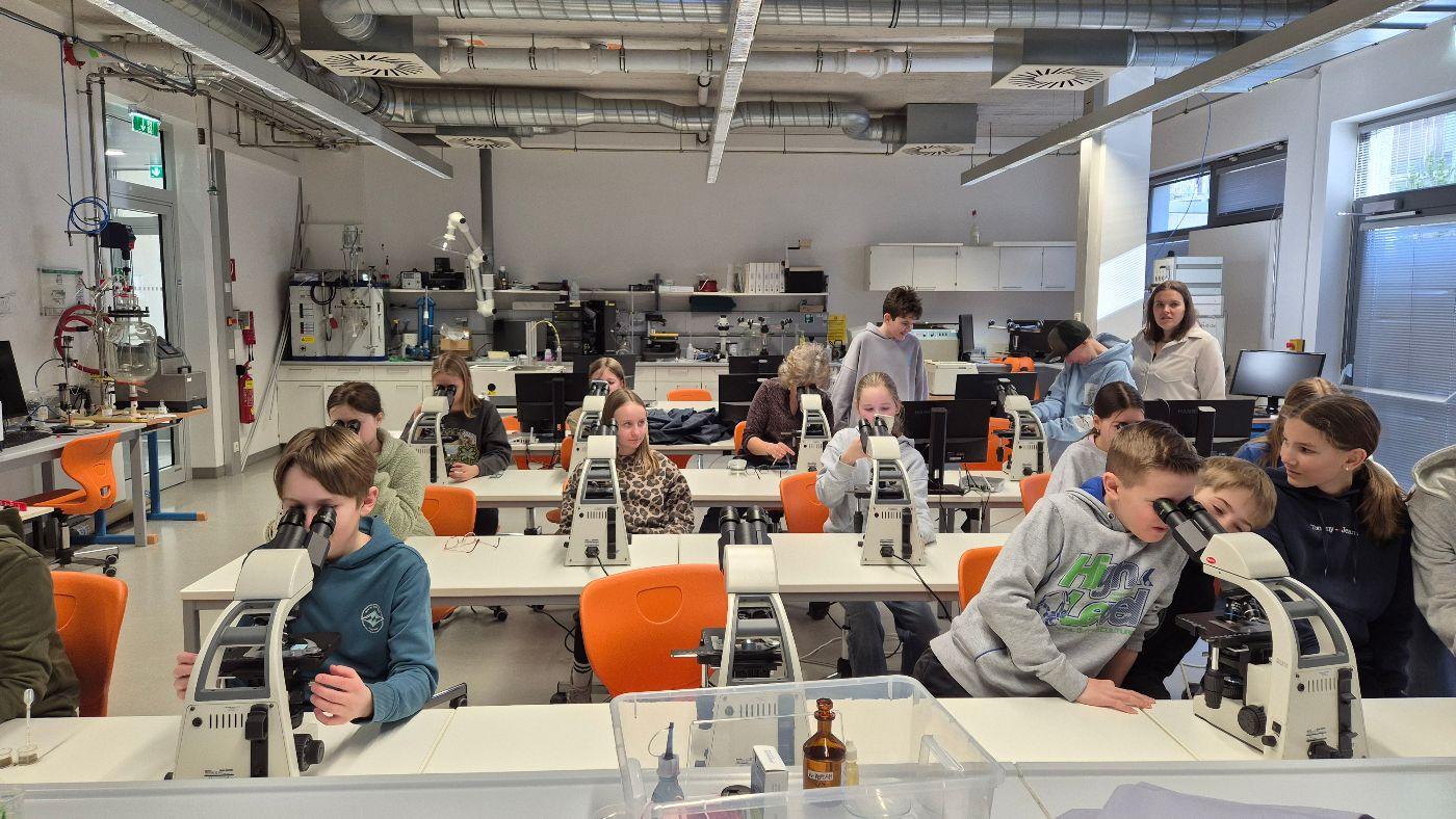 In den 2. Klassen lernen wir gerade die Mikroorganismen kennen. Um noch tiefer in die Welt dieser kleinsten Wesen einzutauchen, machten wir einen Ausflug in die HTL Kramsach. Mit Hilfe von Profi-Mikroskopen konnte dort entdeckt werden, welche Kleinstlebewesen im Reither See und im Hildegardgarten-Teich leben.