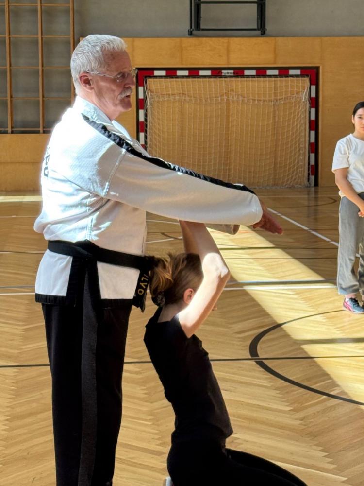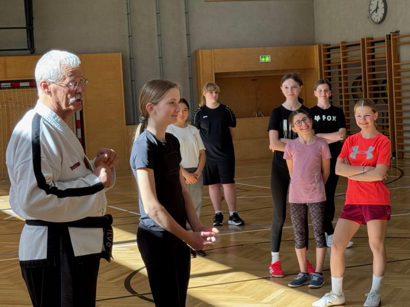 Die Mädchen der dritten und vierten Klasse beschäftigten sich unter Anleitung von Christian Zangerl (Budo Akademie Wörgl) intensiv damit, wie man sich im Falle eines Angriffes wehren bzw. schützen kann. Verschiedene Situationen wurden dabei angenommen (würgen, festhalten, ...) und entsprechende Techniken geübt, mit deren Hilfe man sich aus diesen Situationen befreien kann. Die jungen Damen waren eifrig mit dabei ... und jede von ihnen hofft, nie in der Realität in so eine Situation zu geraten ...